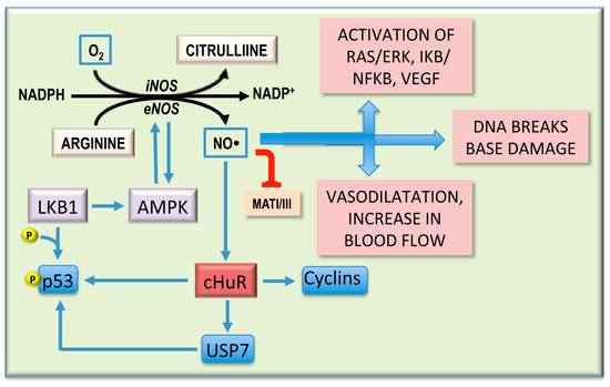 Synthesis and effects of nitric oxide (NO•). NO• induces the nuclear to cytoplasmic HuR translocation, resulting in stabilization of cyclins, p53, and USP7 mRNAs. Hyperactive LKB1 induces p53 hyperphosphorylation. The interaction of phosphorylated p53 with USP7 blocks the negative regulation of p53 by MDM2. LKB1 also activates AMPK that induces endothelial NOS (eNOS) and is induced by the latter. The blue arrows indicate activation; the red blunt arrows indicate inhibition.