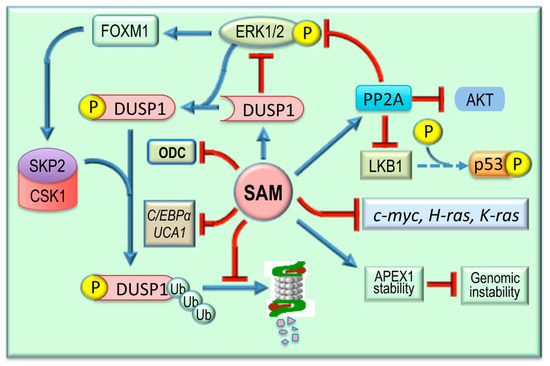 Effects of SAM on signal transduction pathways. SAM is involved in the stabilization of the DNA repair enzyme APEX1, thus reducing genomic instability. Through the inhibition of LKB1/AMPK axis, SAM controls p53 phosphorylation and cell growth and survival by inducing PPA2 expression that phosphorylates and inactivates AKT and its targets. Moreover, PPA2 activation and DUSP1 stabilization inhibit the RAS/ERK pathway. The inhibition of ERK1/2 activity by DUSP1 is controlled by DUSP1 phosphorylation of Ser296, which allows its ubiquitination by the SKP2–CSK1 ubiquitin ligase and proteasomal degradation, as well as by SKP2–CSK1 activation operated by FOXM1, a major target of ERK1/2. SAM also affects the cell cycle by inhibiting c-MYC, H-ras, and K-ras expression and ODC activity. Finally, the antitumor effects of SAM could also be exerted through inhibition of C/EBPα and UCA1 expression.