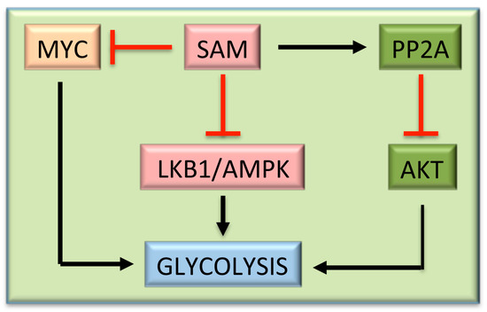 Effects of SAM on glycolysis. Black arrows indicate activation, blunt red arrows indicate inhibition.