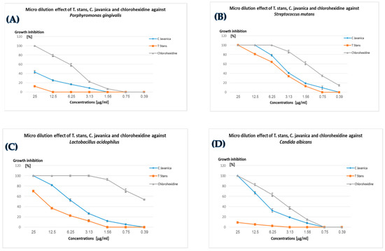 Percentage of microbial growth inhibition at different concentrations of Cassia javanica, Tecoma stans, and chlorhexidine against Porphyromonas gingivalis (A), Streptococcus mutans (B), Lactobacillus acidophilus (C), and Candida albicans (D). The results are expressed as the mean ± standard deviation (SD) obtained from three independent experiments.