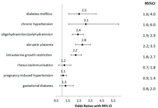 The presence of maternal diseases increases the likelihood of developing a stillbirth during pregnancy or delivery, including: diabetes mellitus (aOR = 2.5; 95% CI 1.6–4.0; p < 0.001), chronic hypertension (aOR = 3.1; 95% CI 1.6–6.0; p < 0.001) and oligohydramnion/polyhydramnion (aOR = 2.4; 95% CI 1.9–2.9; p < 0.001). Pregnancy complications such as abruptio placenta (aOR = 2.8; 95% CI 2.2–3.5; p < 0.001) and intrauterine growth restriction (aOR = 2.2; 95% CI 1.8–2.7; p < 0.001) were associated with stillbirth. Pregnancy with Rhesus isoimmunisation, pregnancy-induced hypertension and gestational diabetes also had higher odds of stillbirth, but not in a statistically significant. Interpretation of the results should take into account frequency for each factor. For example the confidence interval of chronic hypertension is rather wide because the numbers of registered cases are very small. The wider the interval, the greater the uncertainty associated with our estimate (Figure 1).