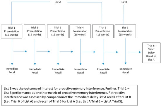 Within the field of neurophysiology, emerging research demonstrates that acute exercise (single bout of exercise) may improve short-term and long-term episodic memory function (retrospective recall of an event in a spatiotemporal context) [,,]; we have discussed the mechanistic details of this effect thoroughly elsewhere [,,,]. A novel line of inquiry, however, is whether acute exercise can attenuate a memory interference effect. Memory interference is often classified into proactive and retroactive memory interference. Proactive interference involves a preceding stimulus interfering with the acquisition and retention of a subsequent stimuli. For example, learning words from List A may interfere with the recall of learning a second list (i.e., List B). Retroactive interference, however, involves a subsequent stimulus interfering with the recall of a previously encoded stimuli. For example, after learning words from List A and then List B, the encoding of List B may interfere with the subsequent retrieval of List A.