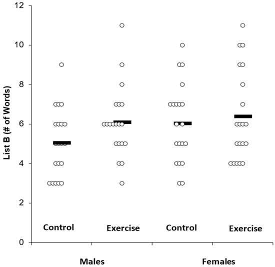 In a 2 × 2 ANOVA with the outcome being List B, there was a main effect for condition (F(1,38) = 5.75, P = 0.02, n2p = 0.13), but there was no main effect for sex (F(1,38) = 1.39, P = 0.24, n2p = 0.04) and no sex by condition interaction (F(1,38) = 1.44, P = 0.23, n2p = 0.04). Post-hoc tests indicated a Bonferroni-corrected statistically significant difference in List B between exercise (6.2 ± 2.0) and control conditions (5.5 ± 1.9) (t = 2.39, P = 0.02).