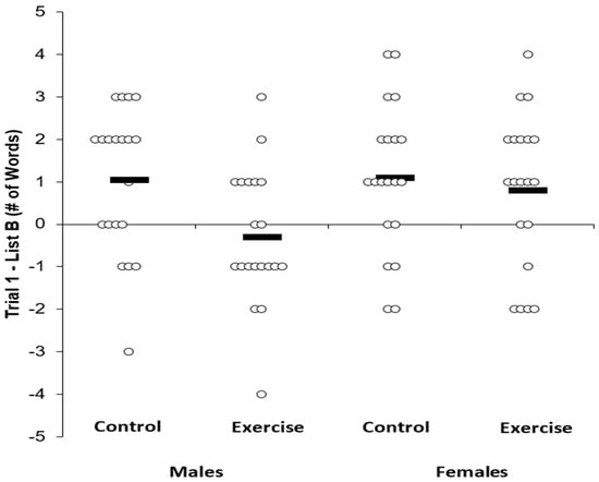 Although we did not observe a main effect for sex (F(1,38) = 1.90, P = 0.17, n2p = 0.05) or condition by sex interaction (F(1,38) = 2.26, P = 0.14, n2p = 0.06) for Trial 1 – List B, in a 2 (male, female) × 2 (Trial 1 exercise, Trial 1 control) ANOVA, there was a main effect for sex for Trial 1 (F(1,38) = 2.26, P = 0.01, n2p = 0.15).