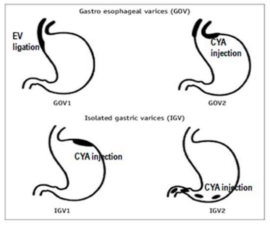 - Wani, Z.A.; Bhat, R.A.; Bhadoria, A.S.; Maiwall, R.; Choudhury, A. Gastric varices: Classification, endoscopic and ultrasonographic management. J. Res. Med. Sci. 2015, 20, 1200–1207. [Google Scholar] [PubMed]