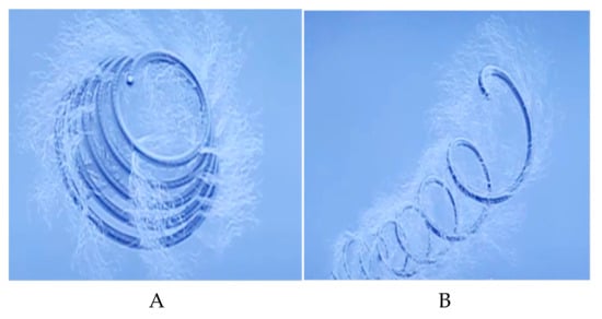 EUS-guided glue and coil treatments are administered successfully and safely. Varices are observed clearly by performing color doppler EUS prior to treatment [25]. The lumen is filled with water for better visualization of gastric fundal varices. EUS should be used in anterograde fashion. Diaphragmatic crus muscle layer should be seen between the esophageal wall and gastric fundal varix. A 19 gauge, 0.035 inch needle is inserted into the varix transesophageally, followed by insertion of coils. The most popular coils are Tornado- and Nester-type coils (Figure 2a,b). These coils have a diameter of 8–20 mm and have fibrillary structures on them, to which platelets adhere, where they coagulate and cause closure within the varix. The diameter of the coil to be used is calculated with EUS. A 20% excess is calculated over the varix diameter. The stylet is pulled back and the coils are pushed into the varix with the assistance of stylet. Immediately after coil application, 1 ml of 2-Octyl-cyanoacrylate is administered into the varix with the same needle. Varix obliteration rate with glue is 94.7% compared to 90.9% with EUS-guided cyanoacrylate application [12,13,14]. Controls are performed one month later, usually demonstrating disappearance of varices. Some complications may occur in 57.9% of the patients treated with the glue method and in 9.1% of those for whom endoscopic cyanoacrylate was used. Interestingly, CT shows embolism in 9.1% of patients treated with the glue method but no symptoms are observed in 80% of these patients [13,14].
