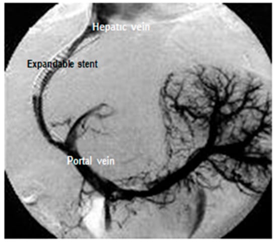 A transjugular intrahepatic portosystemic shunt, or TIPS, is a procedure that creates a shunt between portal vein and hepatic venous systems via transjugulary venous way placing a stent in the liver parenchyma at the interventional radiology department [18,21]. A TIPS reduces esophageal variceal bleeding and treat complication with liver cirrhosis, such as refractory ascites. For a TIPS, access is gained via the transjugular veins, when a metal-coated expandable stent is inserted in the liver with v. hepatica end branch and v. porta end branch (Figure 3). Thus, portal pressure is reduced, leading to reduced varix pressure and, therefore, reduced bleeding. This procedure should be performed by experienced professionals in interventional radiology centers.