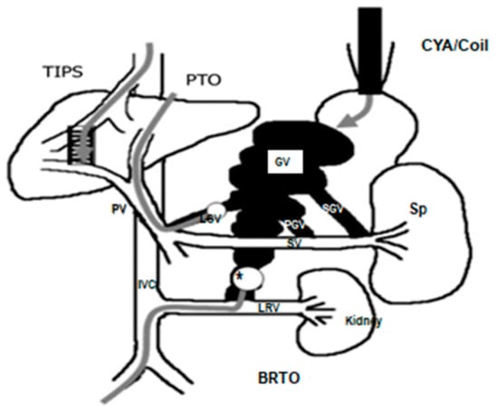 Basic porto-systemic venous anatomy of GV with the shunts and treatment modalities; CYA—α-cyanoacryrate glue, TIPS—transjugular intrahepatic portosystemic shunt, PTO—percutaneous transhepatic obliteration, BRTO—balloon-occluded retrograde transvenous obliteration, IVC—inferior venacava, LGV—left gastric vein, SGV—short gastric vein, PGV—posterior gastric vein, LRV—left renal vein, PV—main portal vein, SV—splenic vein, GV—gastric varices; Sp—spleen. *Conventional BRTO procedure through transfemoral approach with a balloon in the gastrorenal shunt. Modified from [26].