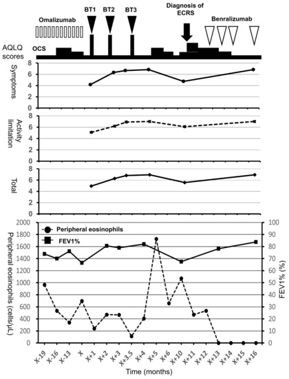 Clinical course and asthma quality-of-life questionnaire scores for a 56-year-old man with severe asthma and eosinophilic chronic rhinosinusitis. In the top panel, the open bars indicate treatment with omalizumab, the closed arrow heads indicate treatment with BT, and the open arrow heads indicate treatment with benralizumab. In the middle panel, the closed circles with the straight line indicate the symptom scores, the closed squares with the broken line indicate the activity limitation scores, and the closed rhombuses with the straight line indicate total scores. In the bottom panel, the closed circles with the broken line indicate peripheral eosinophils and the closed squares with the straight line indicate FEV1%. AQLQ, asthma quality-of-life questionnaire; BT, bronchial thermoplasty; ECRS, eosinophilic chronic rhinosinusitis; FEV1%, forced expiratory volume % in 1 s; OCS, oral corticosteroids.
