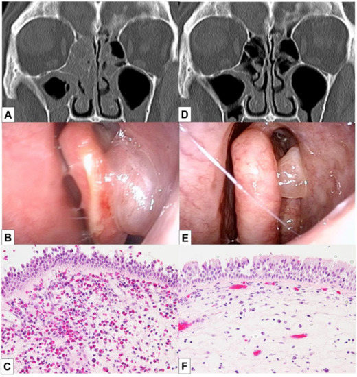 The patient underwent BT 5 years after the diagnosis of asthma and experienced improvements in the scores of asthma quality-of-life questionnaire (AQLQ) and FEV1% (Figure 1) [10]. Two months after BT, however, his asthma exacerbated and blood eosinophil count and FeNO level increased, necessitating OCS therapy. The hypereosinophilia became aggravated when the OCS dose was tapered; consequently, a high dose of 10 mg/day or greater was required for the control of asthma symptoms and hypereosinophilia (Figure 1). Six months after BT, FEV1% exhibited a slight decrease, and the patient experienced both nasal congestion and hyposmia. CT revealed dominant ethmoid sinus shadows (Figure 2A), and the Lund–Mackey score for chronic rhinosinusitis was 6 [11]. Endoscopy revealed nasal polyps, and pathological examination showed eosinophilic infiltration (eosinophil count in the nasal polyps was 215–369 per high-power field (Figure 2B,C). A diagnosis of severe asthma with ECRS was made and benralizumab treatment was initiated. The patient received 30 mg of benralizumab by subcutaneous injection once every 4 weeks for the first three doses, followed by an injection every 8 weeks thereafter. During the initial 4 weeks of treatment, the blood eosinophils were completely depleted, and both AQLQ and FEV1% scores increased (Figure 1). Surprisingly, at 16 weeks after treatment initiation, the ethmoid sinus shadows observed on CT images (Figure 2D) had resolved. The nasal polyps (Figure 2E) had reduced in size; moreover, eosinophilic infiltration in nasal polyps was reduced at 1 year after treatment initiation (eosinophil count in nasal polyps was 0–2 per high-power field; Figure 2F), with improved nasal visual analog scale (VAS) scores. The CT scores improved from 6 to 2, while the nasal VAS scores improved from 5 to 0. Moreover, the OCS dose could be gradually tapered from 30 mg/day to 3 mg/day by 16 weeks.