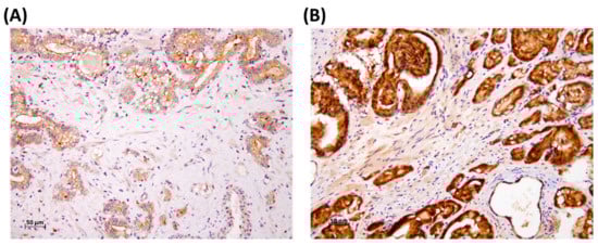Our study examined 71 tumor samples from patients with PCa. The cancers were staged according to the American Joint Committee on Cancer (AJCC) Cancer Staging Manual. The clinicopathological features that were assessed in this study, including histology, tumor node metastasis (TNM) stage, and Gleason score, were confirmed by two pathologists. Patients with primary PCa and tissue available from a bio-bank were included in this study. Those with either missing data or tissue loss during the staining procedure were excluded from this study. The study was approved by the Institutional Review Board and the Ethics Committee of the Changhua Christian Hospital, Changhua, Taiwan (CCH IRB 161117, approved on 18 January 2017).