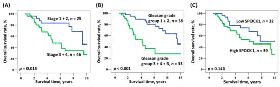 Figure 2A demonstrates the Kaplan–Meier analysis of overall survival according to stage. The pathological stage 1 + 2 group had a better overall survival trend compared with the stage 3 + 4 group (p = 0.015). The lesser Gleason grade group (1 + 2) also showed a similar trend (p < 0.001), which is demonstrated in Figure 2B. Lower overall survival was noted in the high SPOCK1 expression group compared with the low expression group, but it was not statistically significant (p = 0.141, Figure 2C).