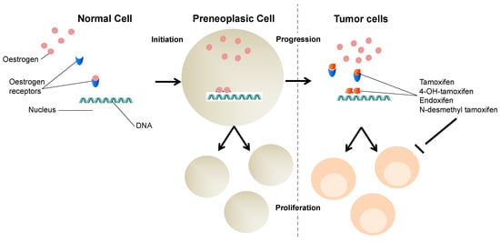 Tamoxifen action. Tamoxifen acts as an estrogen competitor. Estrogens are lipid hormones that are able to pass through membranes and bind to their receptors in cytoplasm. The complex estrogen–estrogen receptor enters the nucleus and dimerizes with another similar complex. Estrogens have a transcription mode of action contributing, among others, to cell proliferation. Breast cancer cells have an increased expression of estrogen receptors and tamoxifen, and its potent metabolites, such as 4OH-tamoxifen and endoxifen. Those will bind to them, in order to, hopefully, inhibiting cancer cells proliferation.