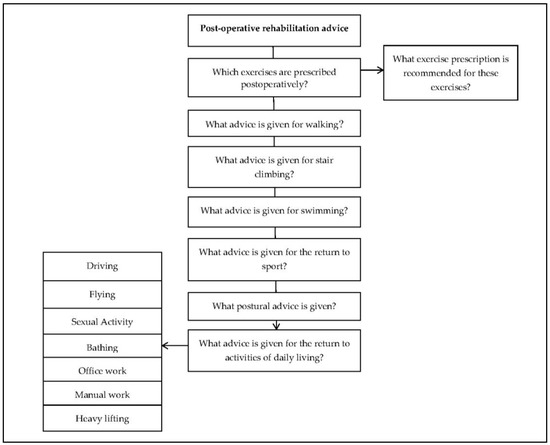 To develop a suitable data extraction procedure, a sample of five patient information leaflets were sourced and used for pilot testing. A flowchart was created which addressed various elements of the postoperative rehabilitation advice listed within patient information leaflets, for example: exercise prescription, walking and stair climbing advice, return to sport and return to activities of daily living. Two members of the research team (LB and ML) reviewed the flowchart individually and discussed any changes that needed to be made to the methodology.