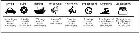 A number of the leaflets recognised that returning to certain normal activities required further advice presumably following a re-assessment—examples include asking the surgical team at a follow up appointment on advice on returning to work, while other leaflets suggest requesting advice from a general practitioner (GP). More commonly, patients were advised to discuss activities that involve a greater perceived risk (for example, return to manual work or high impact activities) directly with their surgeon.