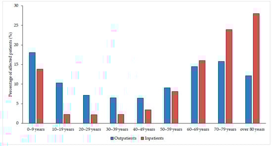 Age distribution of the affected patients in the outpatient and inpatient groups.