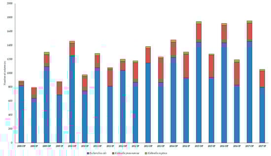 Some limitations of this study must be acknowledged: firstly, the design of the study is retrospective and there has been an inability to access the medical records of the individual patients affected by these infections. For this reason, the correlation between the existence of relevant risk factors and underlying illnesses (apart from age and inpatient/outpatient status) and the E. coli/Klebsiella spp. UTIs could not be assessed. The age-associated incidence in isolation of these pathogens may also reflect (at least in part) the high rate of bacteriuria in the elderly population (especially in catheterized patients) []. There is a risk of selection bias, as studies describing the prevalence of infectious diseases and resistance trends are mainly tertiary-care centers, which generally correspond to patients with more severe conditions or underlying illnesses. Finally, the molecular characterization of the resistance determinants in the individual isolates was not performed, only to the extent of presence/absence of ESBLs [,].