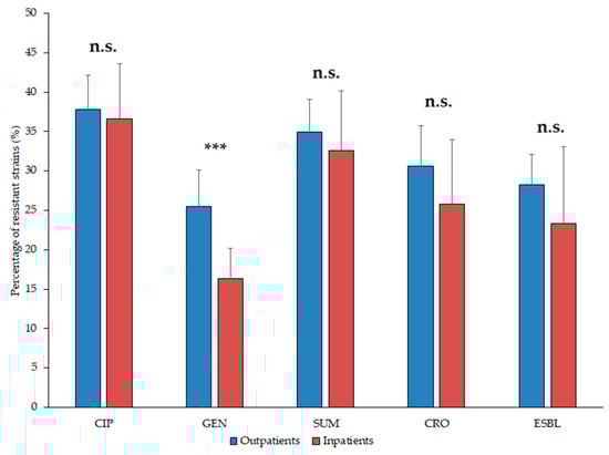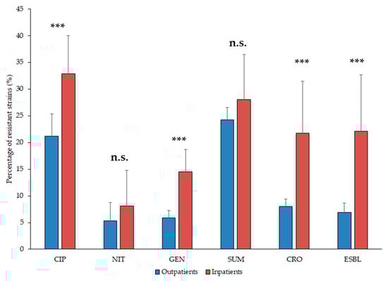 Resistance levels of Escherichia coli isolates from inpatient and outpatient urinary tract infections, expressed in the percentage (%) of resistant isolates. Asterisk (***): p < 0.001; n.s.: not significant; CIP: ciprofloxacin; NIT: nitrofurantoin; GEN: gentamicin; SUM: sulfamethoxazole/trimethoprim; CRO: ceftriaxone; ESBL: extended-spectrum β-lactamase-producing isolates.