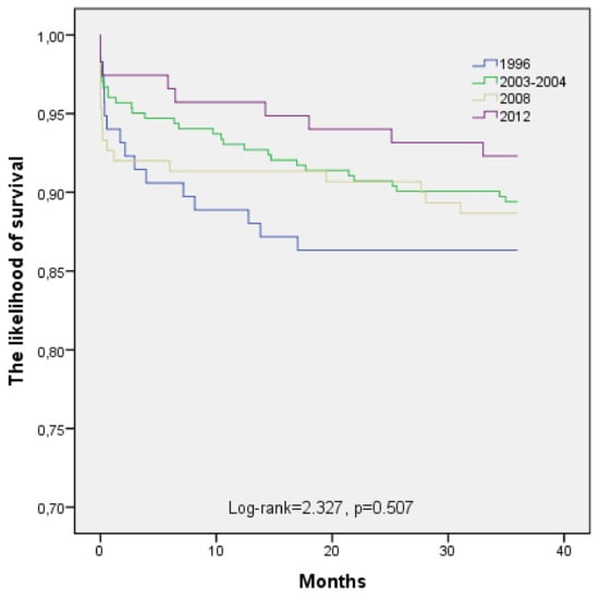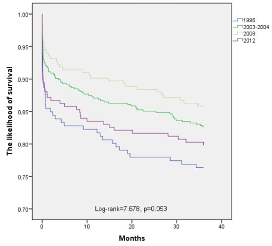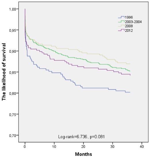 The likelihood of long-term (36 months) survival in 25 to 64-year-old post-AMI Kaunas population in four time-periods (1996, 2003–2004, 2008, and 2012) is presented in Figure 1. According to the data of the Kaplan–Meier survival analysis, long-term survival of 25 to 64-year-old post-AMI persons was without significantly difference in 1996, 2003–2004, 2008, and 2012 (Log-rank = 6.736, p = 0.081).