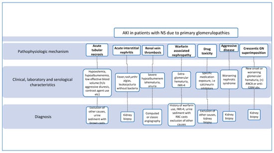 This review aims to explore the clinical circumstances and pathogenetic mechanisms of AKI in patients with NS, focusing on newer perceptions regarding the pathogenesis and management of this complicated condition, for the prompt recognition and timely initiation of appropriate treatment in order to restore renal function to its baseline level.