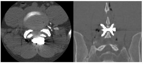 - Bonaldi, G.; Bertolini, G.; Marrocu, A.; Cianfoni, A. Posterior vertebral arch cement augmentation (spinoplasty) to prevent fracture of spinous processes after interspinous spacer implant. AJNR Am. J. Neuroradiol. 2012, 33, 522–528. [Google Scholar] [CrossRef]