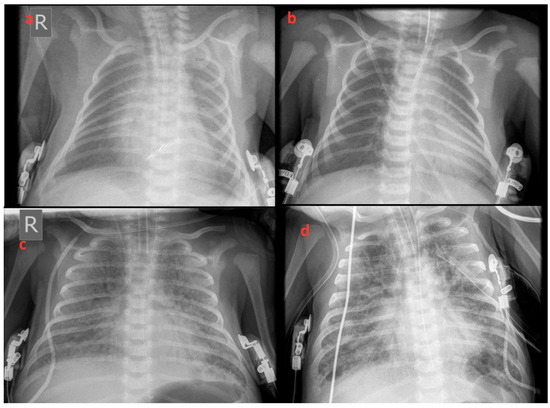 X-rays revealed increased whitening of the lungs consistent with respiratory distress syndrome (RDS) progressively deteriorating from the 1st to 75th day of life. (a) 1st, (b) 3rd, (c) 15th, and (d) 75th day of life.