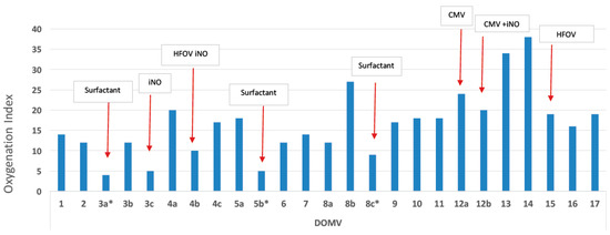 Variance of the oxygenation index during the early 17 days of life, while the patient was treated with mechanical ventilation. The red arrows indicate oxygenation index after treatments (the intervention resulted in lowering the oxygenation index). iNO: inhaled nitric oxide, HFOV: high frequency oscillatory ventilation, CMV: conventional mechanical ventilation, DOMV: day of life on mechanical ventilation.