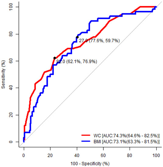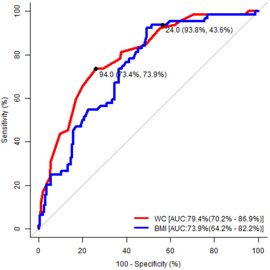 Receiver operating characteristic analysis to determine the optimal cut-off values of the significant anthropometric indices to predict the risk of developing obstructive sleep apnea (OSA) in females. WC: waist circumference; BMI: body mass index; AUC: area under the curve.