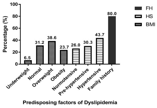 Proportion of predisposing factors among the study participants. FH—Family history of diabetes, HS—Hypertension status, BMI—Body Mass Index.