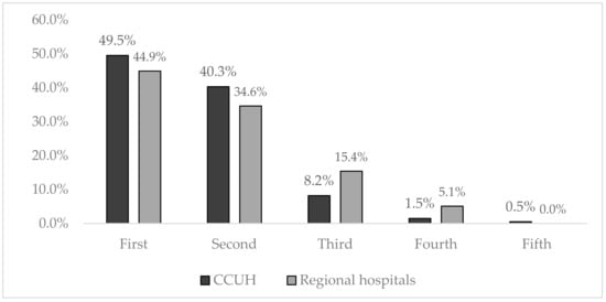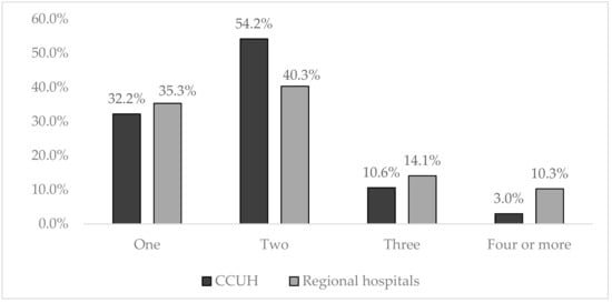 In regional hospitals altogether, 156 respondents completed the questionnaire, 93.0% (n = 146) of whom were mothers aged 18–48 years (median age 31 years), 5.7% were fathers (n = 9) aged 30–43 years (median 34 years), and 2 were grandparents; 36.4% of respondents had higher education. Most of the families enrolled in both CCUH and regional hospitals had one or two children, but the families having three or more children were significantly more common among the participants in the regional hospitals (OR (95% CI) = 2.1(1.2–3.9), p = 0.009). The number of children in the families of participants is reflected in Figure 1.