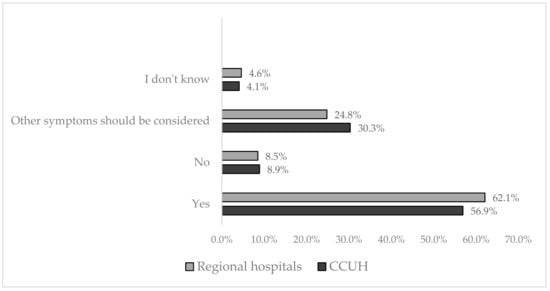 The majority (59.2%) of participants considered fever itself as indicative of serious illness; 27.9% of parents stated that other symptoms should be considered as well to evaluate the illness as serious. Only 9.4% of participants thought that fever alone is not indicative of severity of illness, while 4.3% did not know whether or not it was so. The differences between the opinions stated by participants enrolled in CCUH and regional hospitals can be viewed in Figure 3. There were no significant differences between the beliefs of parents with different education levels or families with one or multiple children.