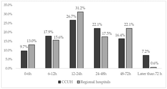 36.6% of patients who first called the ambulance or went to the hospital did so within the normal working hours, with a marked prevalence among the CCUH cohort (45.8%) over parents filling the questionnaire in regional hospitals, where only 20.6% first sought help outside primary care within the working hours.