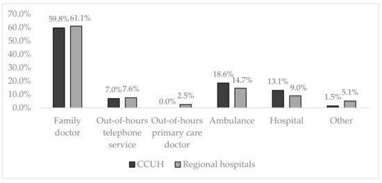 The first doctor visited or contacted during the ongoing febrile episode by majority of participants in CCUH and regional hospitals (68.6%) was a primary care specialist (in 60.1% of cases it was the family doctor, 7.4% contacted the out-of-hours family doctor telephone service, while 1.1% of participants visited an out-of-hours primary care doctor). Participants enrolled in CCUH more commonly were first seen by an ambulance doctor or physician at the hospital (31.7%) than respondents in regional hospitals, whose children in only 23.7% of cases were first examined by these specialists. More details can be viewed in Figure 5.