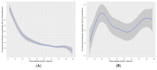 The posterior predictions for the functional H:Q ratio for the knee extension (panel A) and the knee flexion (panel B) are displayed in Figure 2. The functional H:Q ratio for the knee extension was non-linear, remaining higher than 1.0 (i.e., point of equality) from the beginning of the extension until approximately 40° of the knee extension, leveling off below the point of equality thereafter. On average, the functional H:Q ratio for the knee flexion presented did not attain 1.0 across the range of motion. The functional H:Q ratio for the knee in the present sample peaked at 20° and 80°, lowering between these angle positions to below 0.50 at about 0.54.