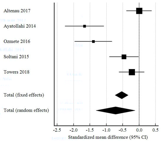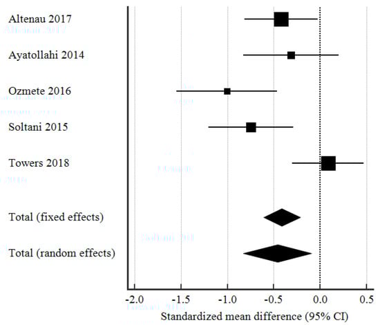 As seen in Figure 2, applying a per-protocol analysis and a random-effects model, there was a significant difference in postoperative opioid consumption between the group that received preoperative IV paracetamol and the placebo group as the pooled SMD (Cohen’s d) was −0.460 (95% CI: −0.828 to −0.092, p = 0.014). However, there was a significant degree of heterogeneity (Table 3) amongst the different studies included in the meta-analysis (I2 = 70.66%), perhaps owing to their diverse protocols. Some studies administered IV paracetamol 15 min before induction while others gave it before surgical incision.