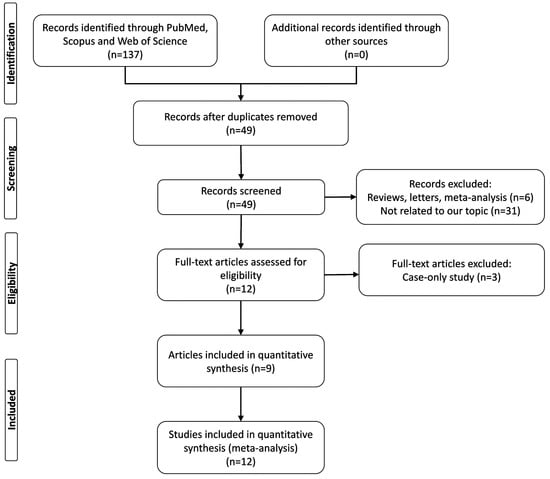 Several studies that have investigated the relationship between the rs2241880 (Thr300Ala) polymorphism in ATG16L1 and several cancers among different ethnic populations have had conflicting outcomes [,,,,,,,,]. Therefore, for the first time, we aimed to conduct a meta-analysis of all available studies published to date to examine the impact of the ATG16L1 rs2241880 polymorphism on cancer susceptibility.