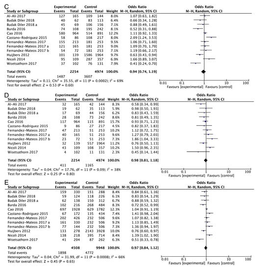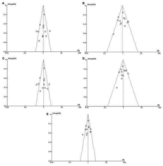 As shown in Figure 2 and Table 2, the findings did not support a correlation between the ATG16L1 rs2241880 polymorphism and cancer risk. Overall, no significant associations were found for AG vs. AA (OR = 0.94, 95% CI = 0.74–1.20, p = 0.63, Figure 2A), CG vs. AA (OR = 0.93, 95% CI = 0.72–1.20, p = 0.58, Figure 2B), AG + GG vs. AA (OR = 0.94, 95% CI = 0.94–1.19, p = 0.60, Figure 2C), GG vs. AG + AA (OR = 0.98, 95% CI = 0.81–1.18, p = 0.80, Figure 2D), and G vs. A (OR = 0.97, 95%CI = 0.84–1.12, p = 0.65, Figure 2E).