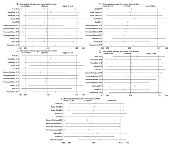 Sensitivity analyses for studies on ATG16L1 rs2241880 polymorphism and cancer risk for AG vs. AA (A), GG vs. AA (B), AG + GG vs. AA (C), GG vs. AG + AA (D), and G vs. A (E).