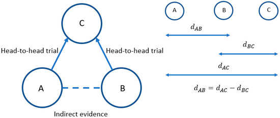 In this simple illustration, there are head-to-head trials comparing treatment A to treatment C and treatment B to treatment C, but no trials comparing treatment A to treatment B. Hence, an indirect comparison must be made to compare treatments A and B.