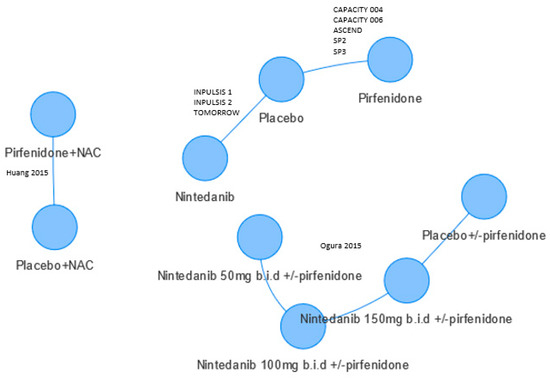 - The efficacy of the combined pirfenidone/nintedanib treatment. As this does not connect to the evidence network, a different methodology such as population matching would be required [27].