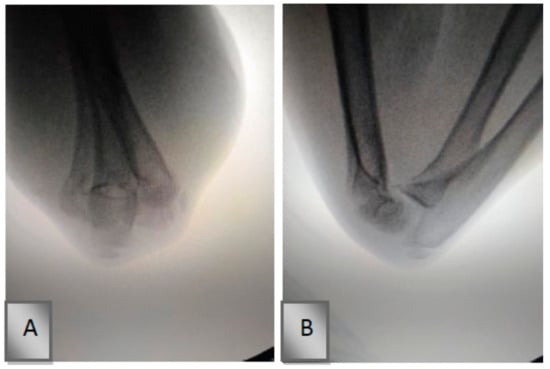 Fluoroscopic image of the supracondylar fracture after fixation with a fabric adhesive bandage. (A) Anteroposterior image and (B) lateral X-ray image of the left elbow.