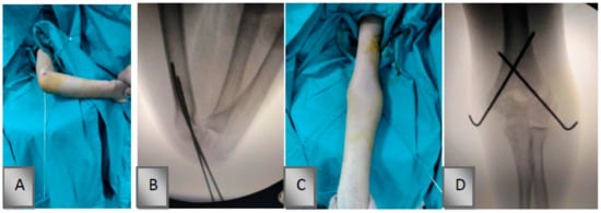 - Mehserle, W.L.; Meehan, P.L. Treatment of the displaced supracondylar fracture of the humerus (type III) with closed reduction and percutaneous cross-pin fixation. J. Pediatr. Orthop. 1991, 11, 705–711. [Google Scholar] [CrossRef]