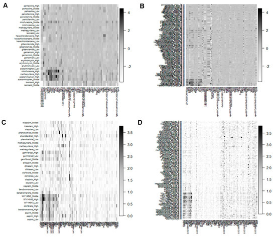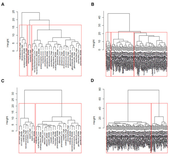 Doses of drugs (DDs) clustering of GMP and PPAR-SP datasets based on the Euclidean distance method in combination with the ward HC method. (A) DDs clustering of GMP dataset at 24 h time point. (B) DDs clustering of GMP dataset at multiple (3 h, 6 h, 9 h, and 24 h) time points. (C) DDs clustering of PPAR-SP dataset at 24 h time point. (D) DDs clustering of PPAR-SP dataset at multiple (3 h, 6 h, 9 h, and 24 h) time point.