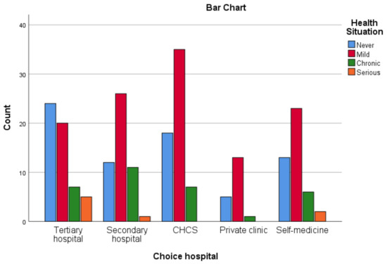 During the year leading up to the survey, 68.6% of the participants had health problems, but most of the problems were mild or chronic. Only 3.5% of the participants had a serious disease that could not be treated at a CHCS under the new Chinese health care rules. The participants’ health situations and their hospital preferences are shown in Figure 1.