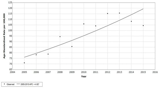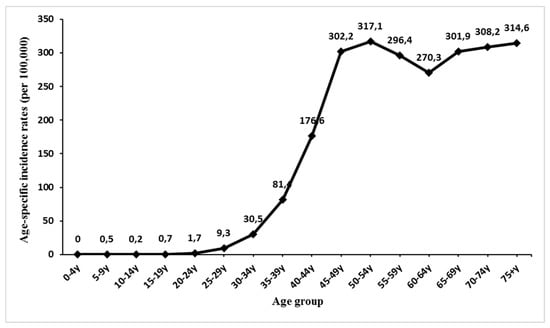 The breast cancer ASR(w) among Lebanese females averaged 91.7 per 100,000 between 2005 and 2015. The rates ranged between 71 and 115.6 per 100,000. The annual percent change (APC) of breast cancer incidence rate, calculated using the joinpoint regression analysis, was found to be +4.6, indicating a significant increase along the years of our study (Figure 1). The APC of breast cancer age-specific rates significantly increased for the age groups 45–49 (p = 0.013, CI [1.5, 10.3]), 50–54 (p < 0.001, CI [4.2, 9.1]), 55–59 (p = 0.001, CI [2.5, 6.9]), 60–64 (p = 0.002, CI [1.9, 6.7]), 65–69 (p = 0.003, CI [2.2, 8.2]), 70–74 (p < 0.001, 95% CI [4.2, 7]), and 75+ years (p < 0.001, CI [3.4, 8.6]) (Table 1). The incidence rate of breast cancer increased with age (R2 = 0.85) and reached a peak of 317.1 per 100,000, for the 50–54 years age group (Figure 2).