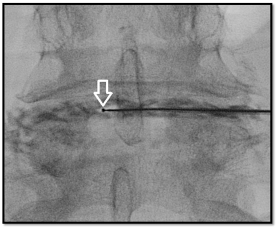 Antero-posterior fluoroscopic view. L4–L5 intervertebral disc nucleoplasty: tip of the wand (white arrow) during ablation, performed clockwise.
