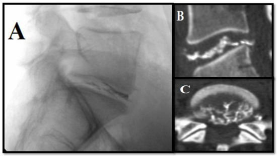 Radiopaque gelified ethanol for L5–S1 disc herniation: (A) Lateral fluoroscopic view: notice radiopaque gel in the L5–S1 disc. (B,C) Post-intervention follow-up CT exam shows optimal intradiscal distribution of the solution.