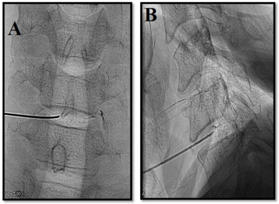 Radiopaque gelified ethanol for cervical disc pathology. Patient with symptomatic C5–C6 intervertebral disc herniation. (A,B) Antero-posterior and lateral fluoroscopic view. Access to the disc is obtained with an antero-lateral approach under fluoroscopic guidance prior to subluxation of the larynx, between the larynx and jugular–carotid vessel. In the cervical tract, a lower quantity of gel is usually injected (ca. 0,3 mL).