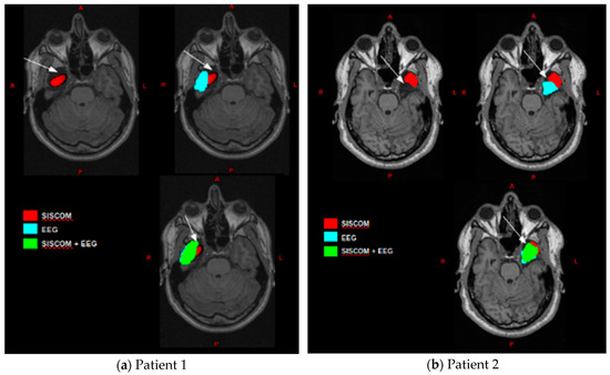 Co-registration of post-operative T1 with EZ images obtained by: subtraction of ictal and interictal SPECT co-registered with MRI (SISCOM) (in red), ictal EEG source imaging (ESI) (blue) and ictal ESI using SISCOM as a prior (green); (a) for patient 1; and (b) for patient 2. A white arrow indicates resection zone.