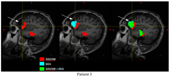 EZ estimated by the proposed methodology and co-registered to post-operative T1-weighted MRI: SISCOM (in red), ictal ESI (blue) and ictal ESI using SISCOM as a prior (green) for patient 3. The white arrow indicates the resection site.